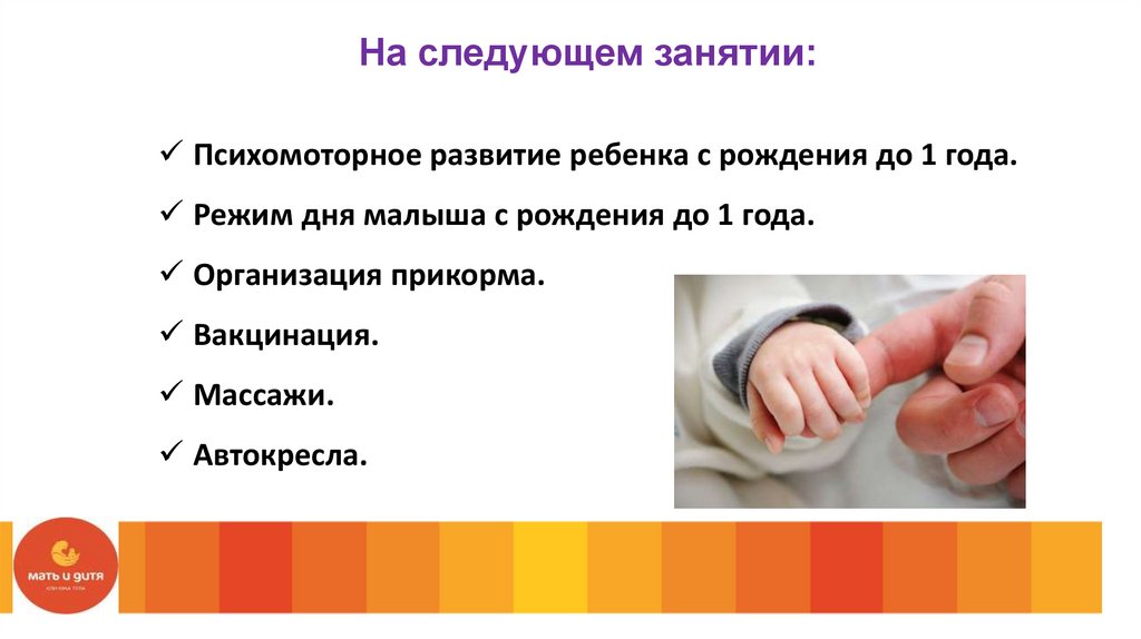 На следующем занятии:Психомоторное развитие ребенка с рождения до 1 года.
