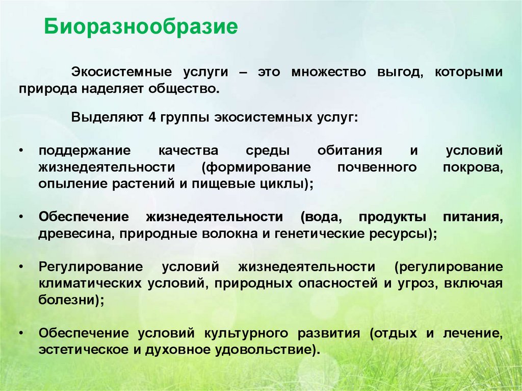 БиоразнообразиеЭкосистемные услуги – это множество выгод, которыми