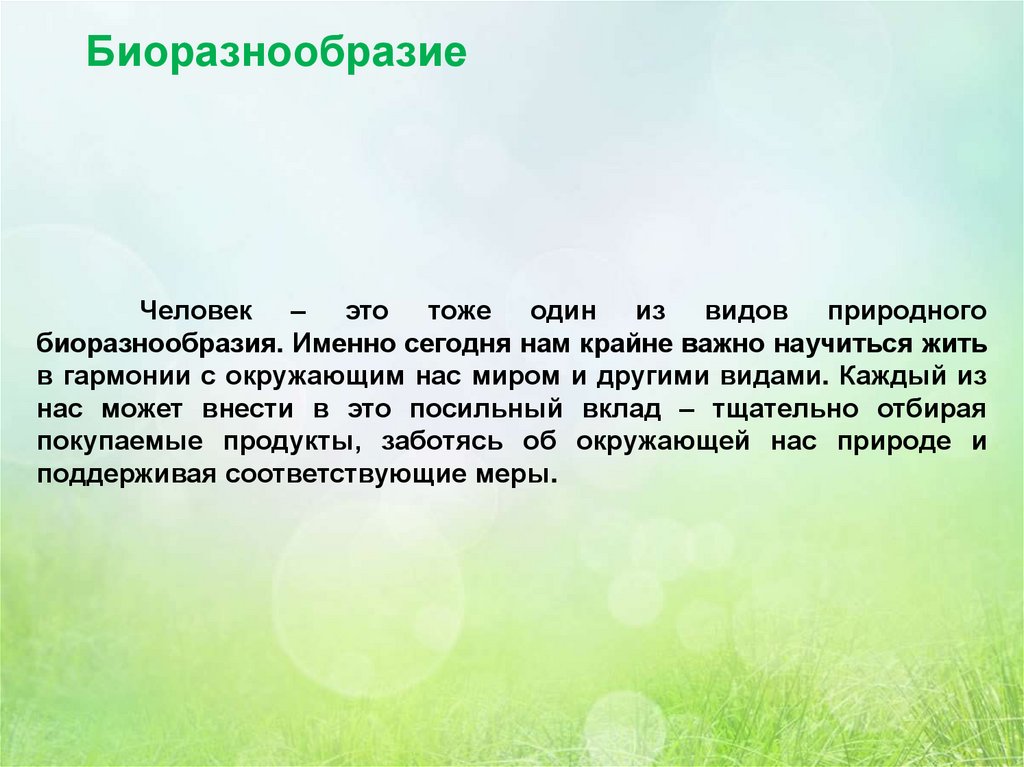 биоразнообразия. Именно сегодня нам крайне важно научиться жить