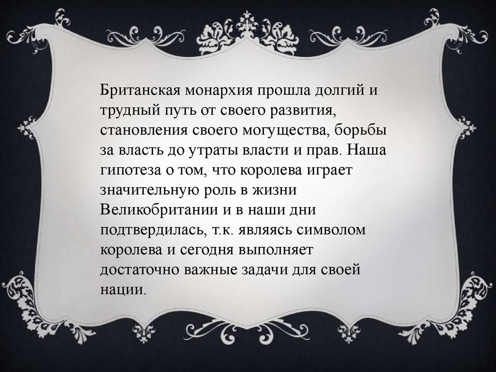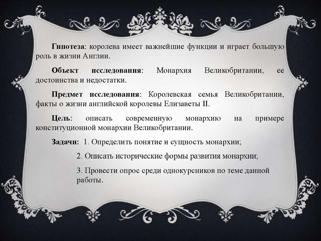 Гипотеза: королева имеет важнейшие функции и играет большуюроль в жизни Англии.
