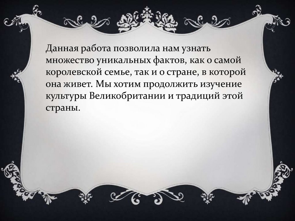 Данная работа позволила нам узнатьмножество уникальных фактов, как о самой