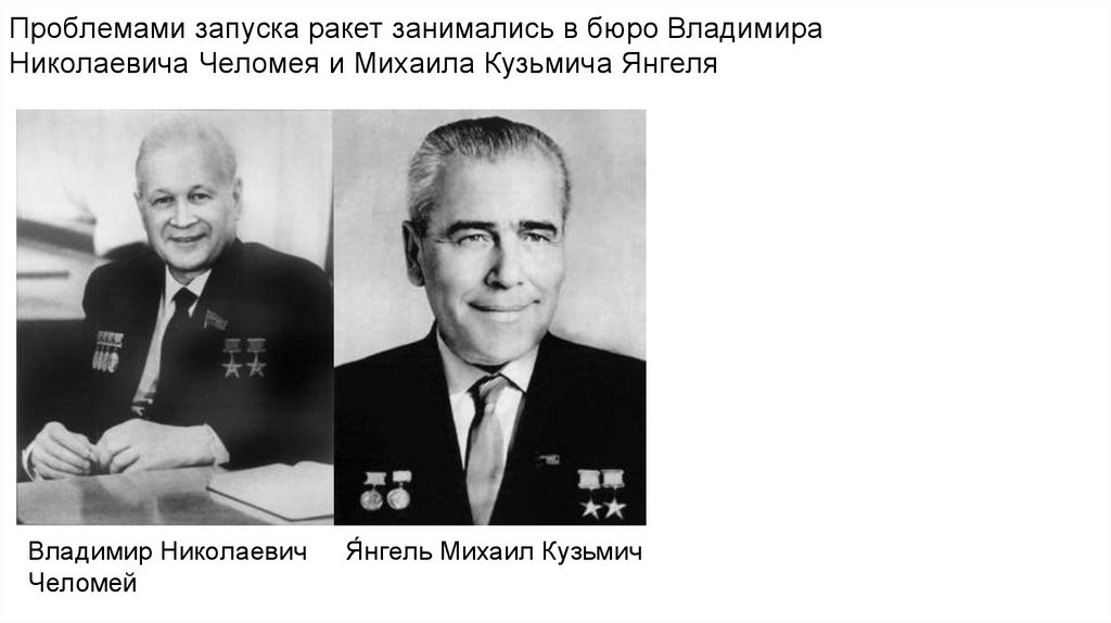 Проблемами запуска ракет занимались в бюро ВладимираНиколаевича Челомея и Михаила Кузьмича Янгеля