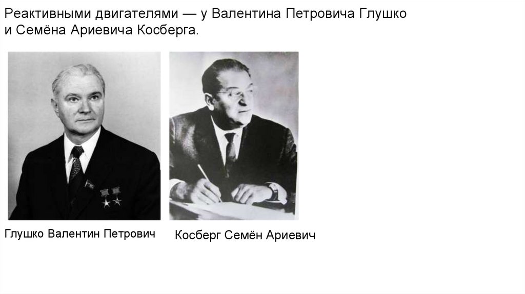 Реактивными двигателями — у Валентина Петровича Глушкои Семёна Ариевича Косберга.