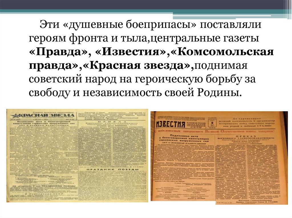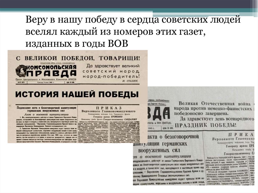 Веру в нашу победу в сердца советских людейвселял каждый из номеров этих газет,