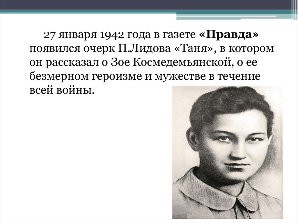 27 января 1942 года в газете «Правда»появился очерк П.Лидова «Таня», в котором