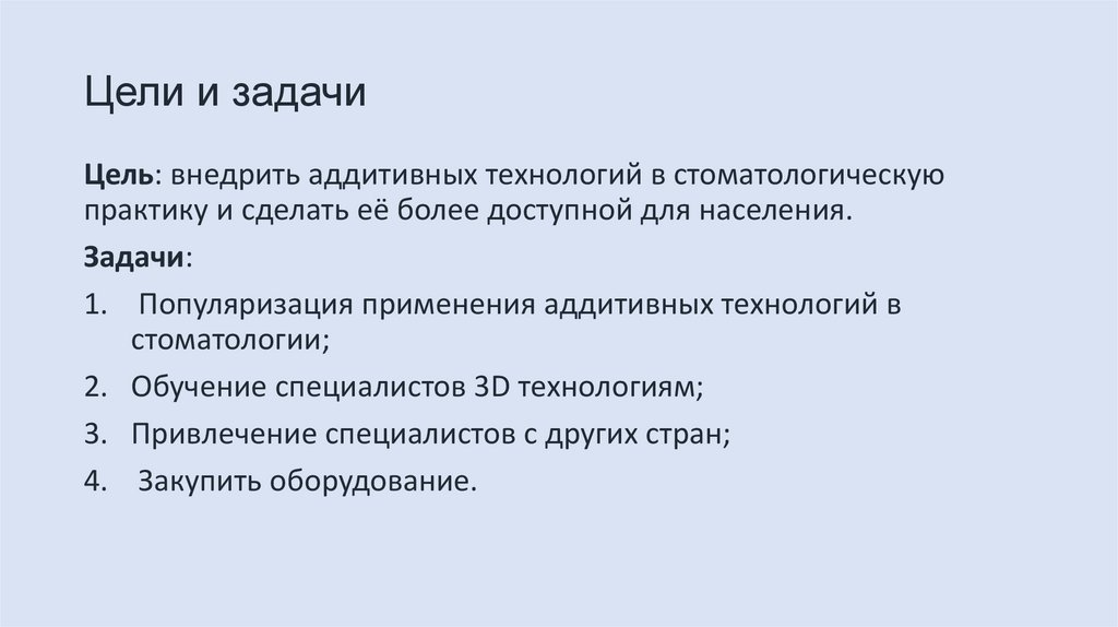 Цели и задачиЦель: внедрить аддитивных технологий в стоматологическую