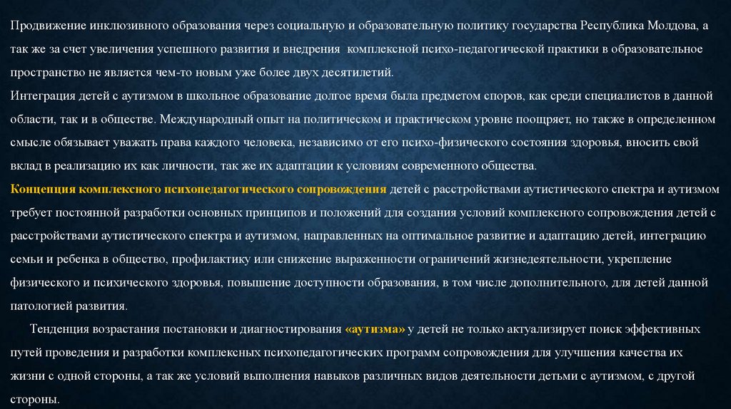 Продвижение инклюзивного образования через социальную и образовательную политику государства Республика Молдова, атак же за счет увеличения успешного развития и внедрения комплексной психо-педагогической практики в образовательное