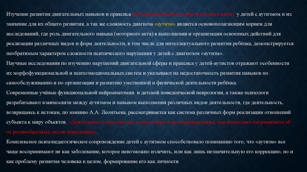 Изучение развития двигательных навыков и праксиса (целенаправленного двигательного акта) у детей с аутизмом и ихзначение для их общего развития, а так же сложность диагноза «аутизм» является основополагающим корнем для