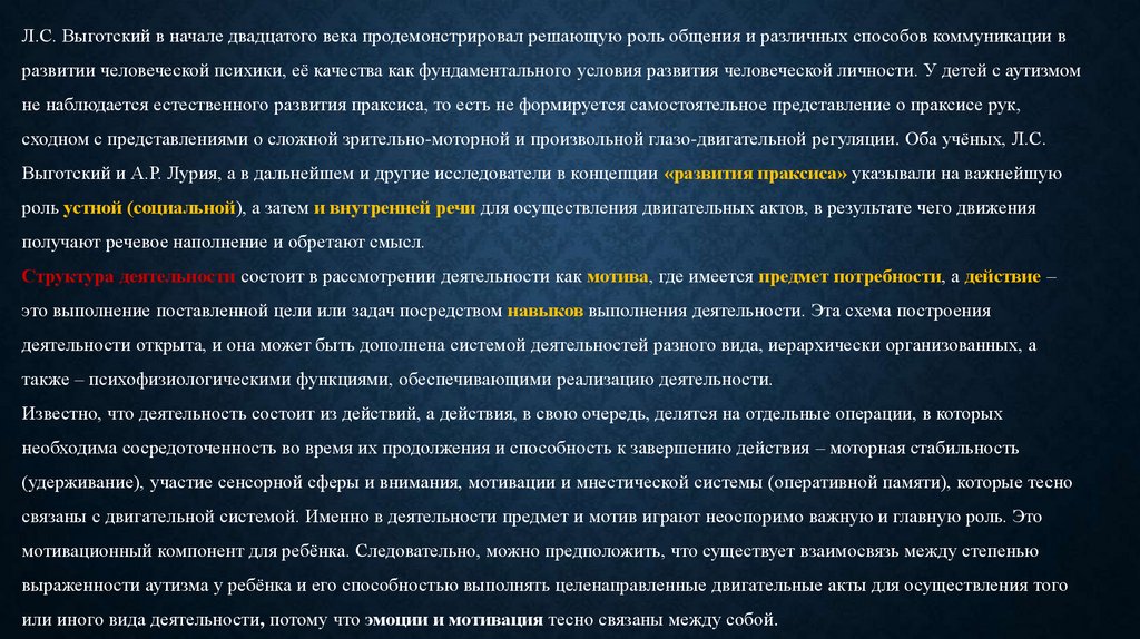 Выготский и А.Р. Лурия, а в дальнейшем и другие исследователи в концепции «развития праксиса» указывали на важнейшую