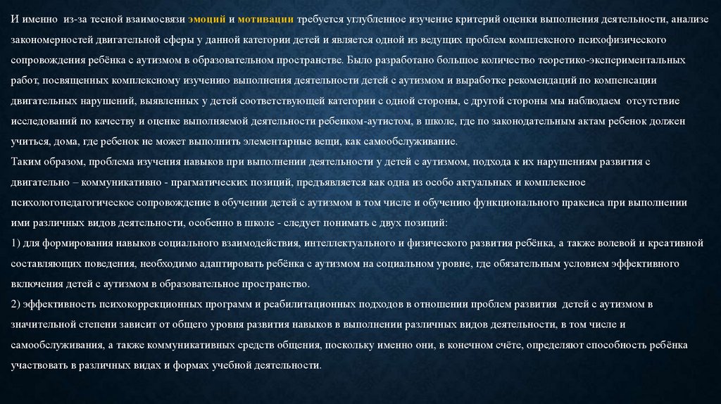 работ, посвященных комплексному изучению выполнения деятельности детей с аутизмом и выработке рекомендаций по компенсации