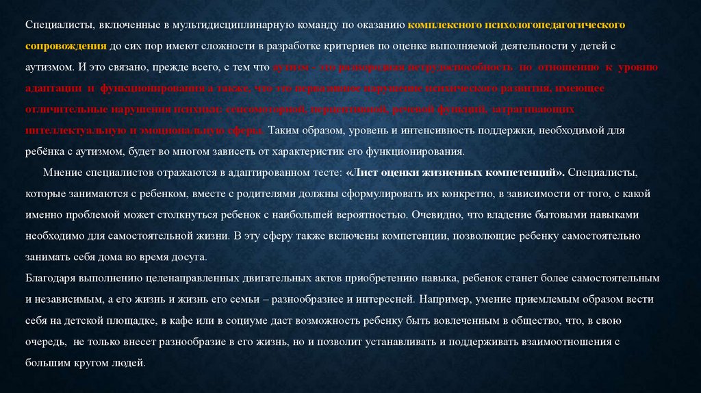 Специалисты, включенные в мультидисциплинарную команду по оказанию комплексного психологопедагогическогосопровождения до сих пор имеют сложности в разработке критериев по оценке выполняемой деятельности у детей с