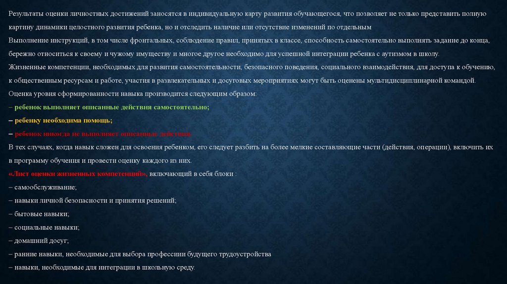 Для оценки продвижения обучающегося с аутизмом в овладении жизненными компетенциями и необходимыми двигательныминавыками для выполнения различных видов деятельности следует разработать критерии по оценке выполнения деятельности