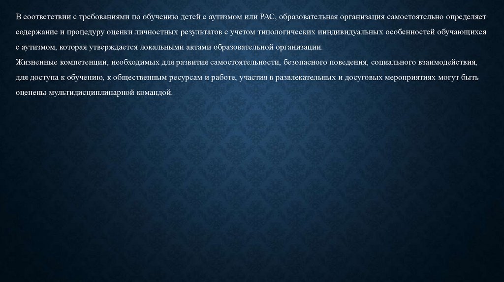 В соответствии с требованиями по обучению детей с аутизмом или РАС, образовательная организация самостоятельно определяетсодержание и процедуру оценки личностных результатов с учетом типологических ииндивидуальных особенностей обучающихся