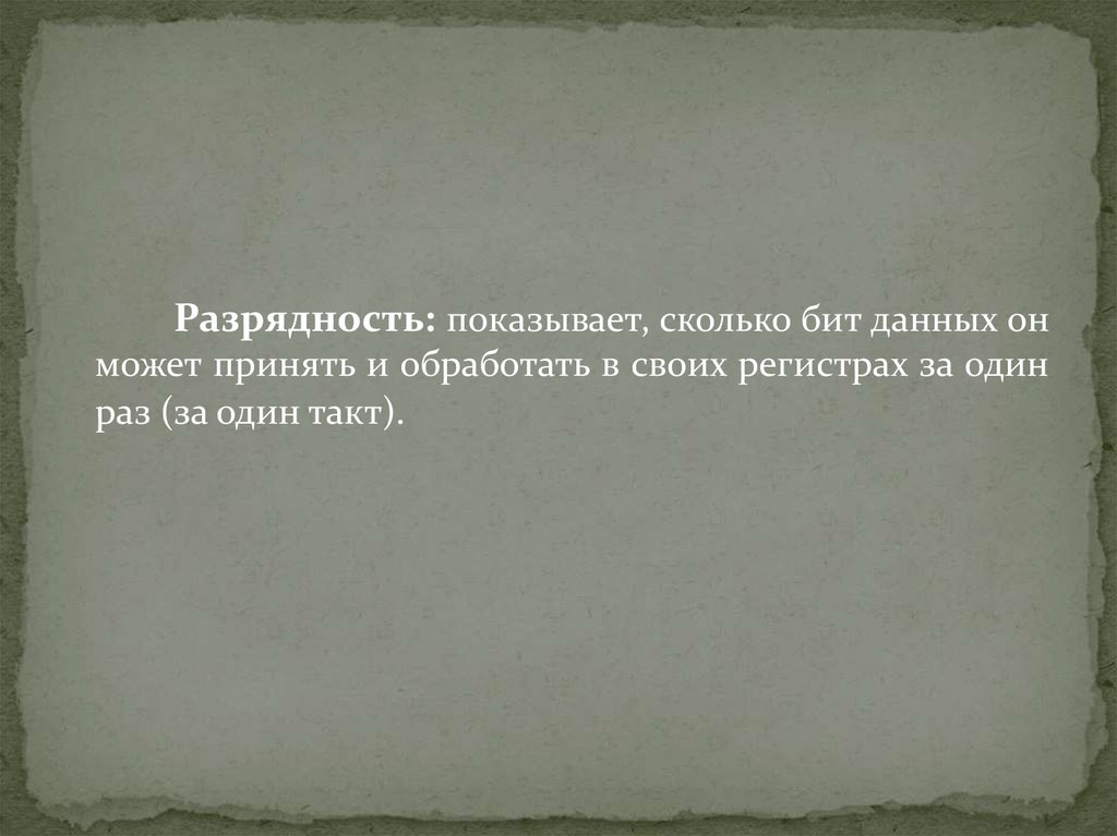 Разрядность: показывает, сколько бит данных онможет принять и обработать в своих регистрах за один