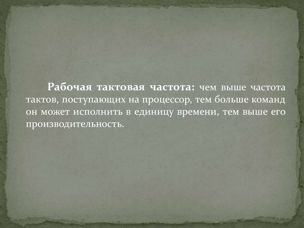 Рабочая тактовая частота: чем выше частотатактов, поступающих на процессор, тем больше команд