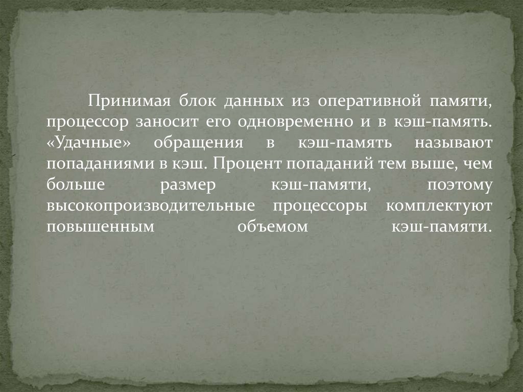 Принимая блок данных из оперативной памяти,процессор заносит его одновременно и в кэш-память.
