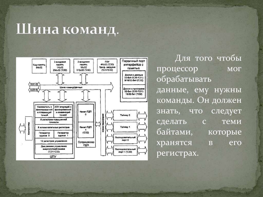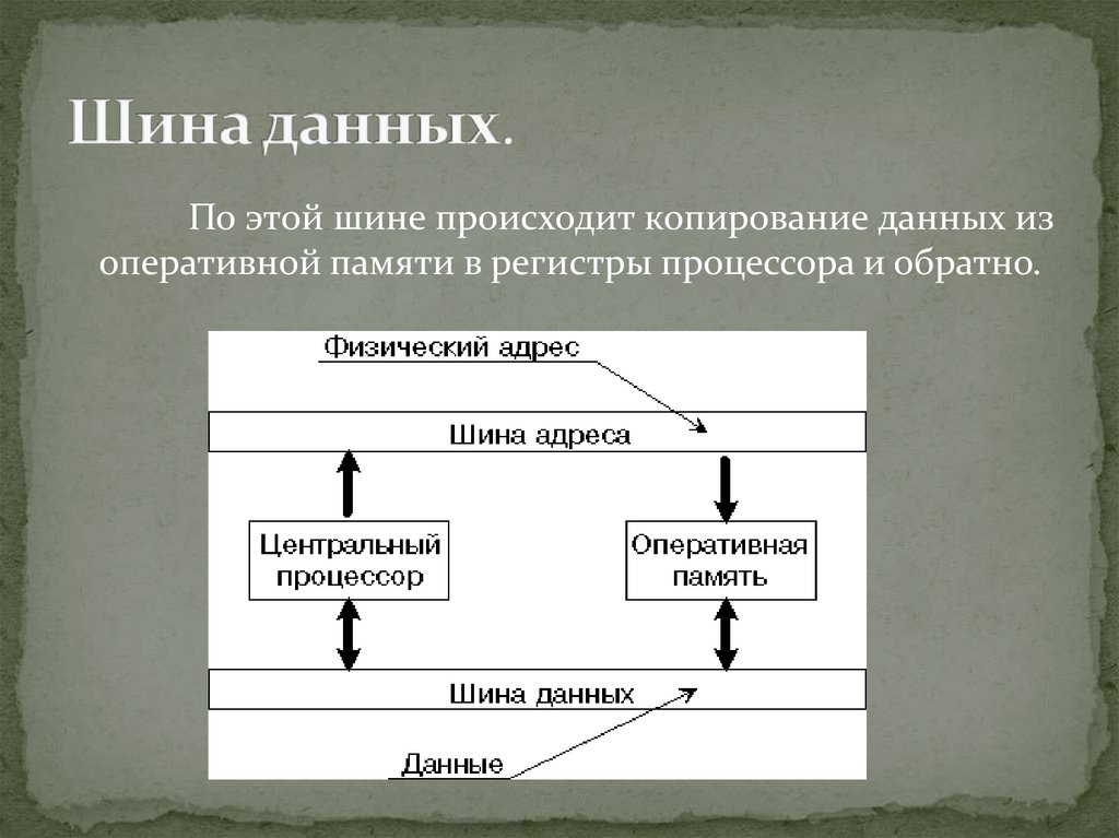 По этой шине происходит копирование данных изоперативной памяти в регистры процессора и обратно.