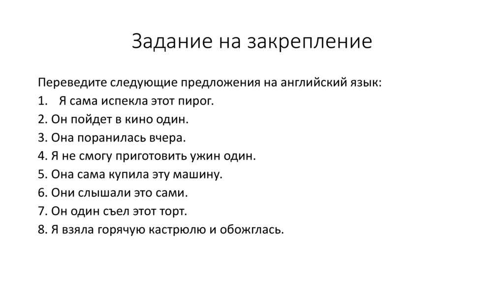 Задание на закреплениеПереведите следующие предложения на английский язык: