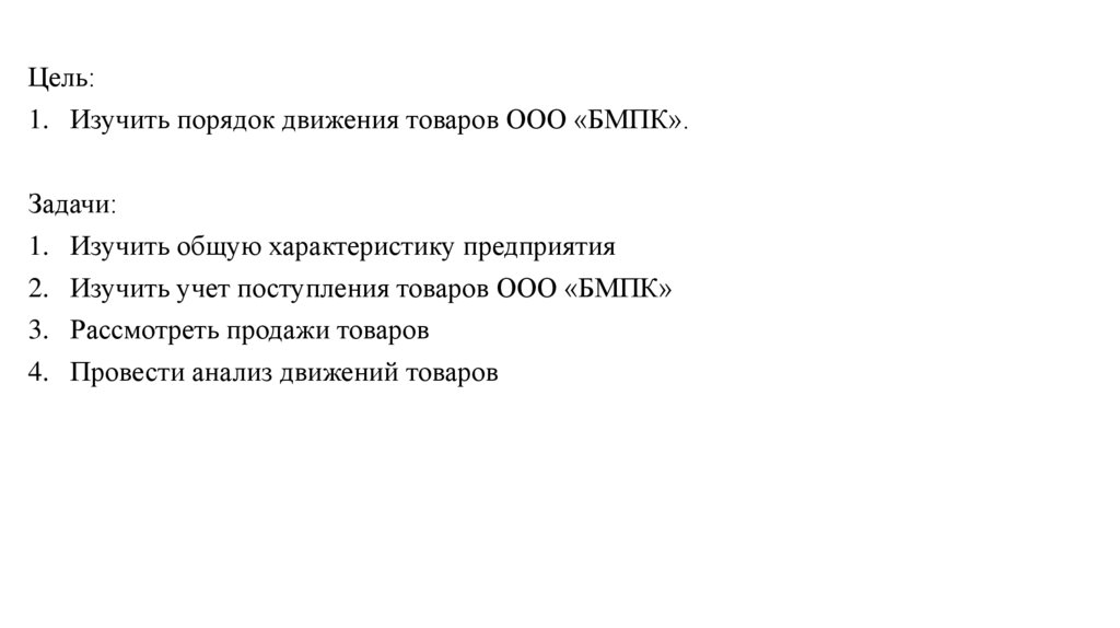 Цель:1. Изучить порядок движения товаров ООО «БМПК».