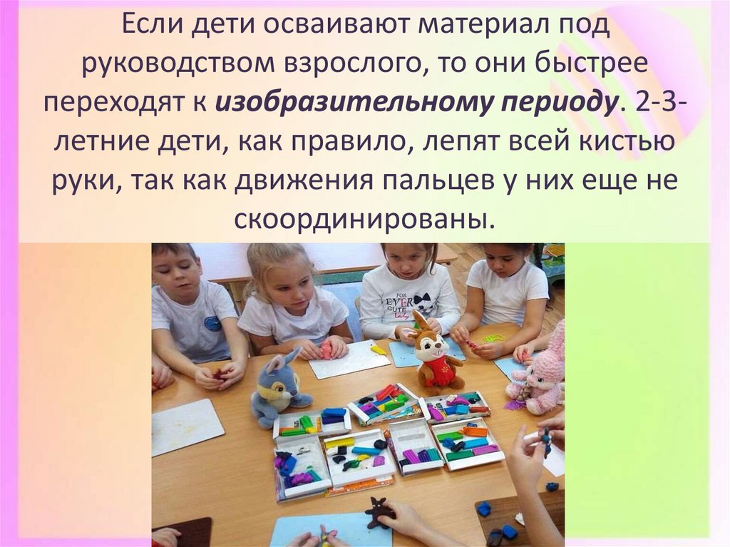 переходят к изобразительному периоду. 2-3летние дети, как правило, лепят всей кистью
