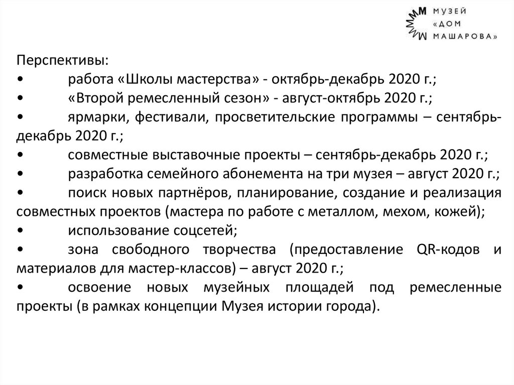 Перспективы:работа «Школы мастерства» - октябрь-декабрь 2020 г.;