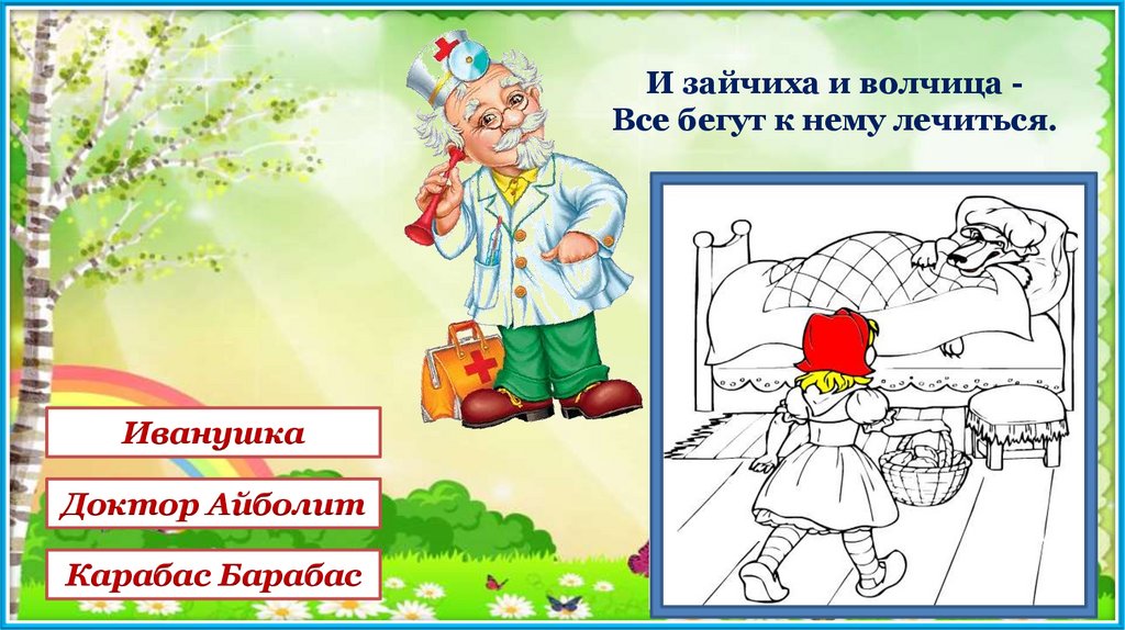 И зайчиха и волчица Все бегут к нему лечиться.Иванушка