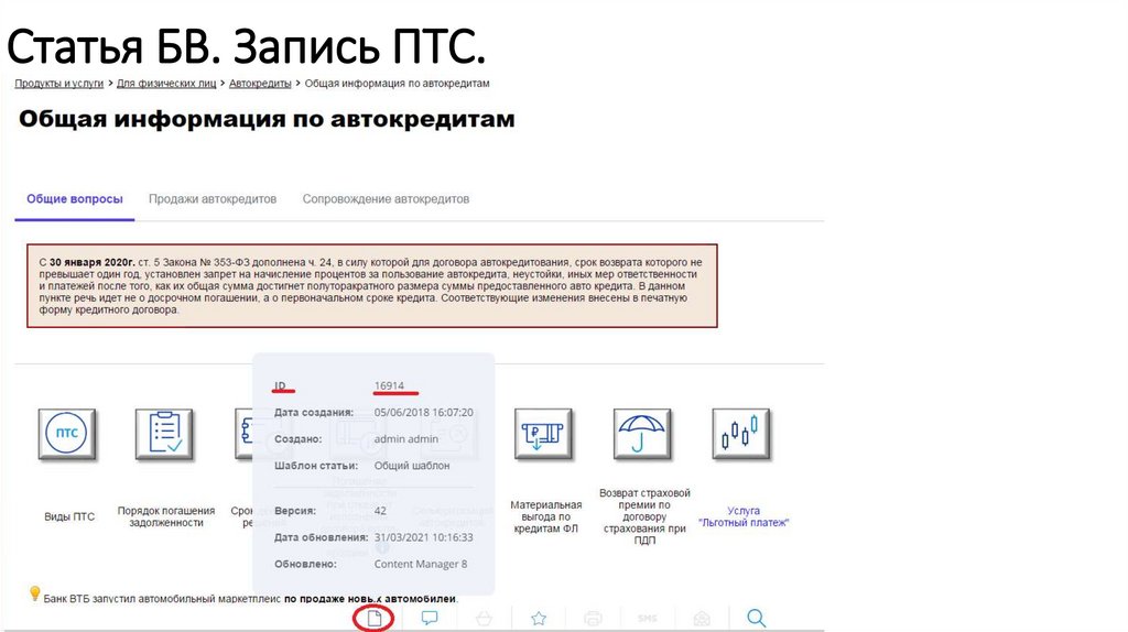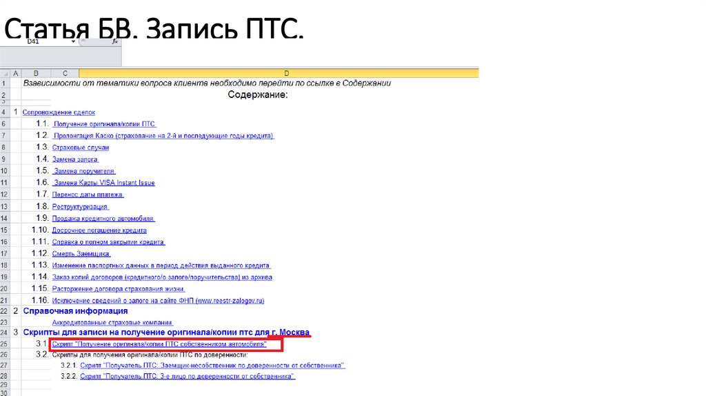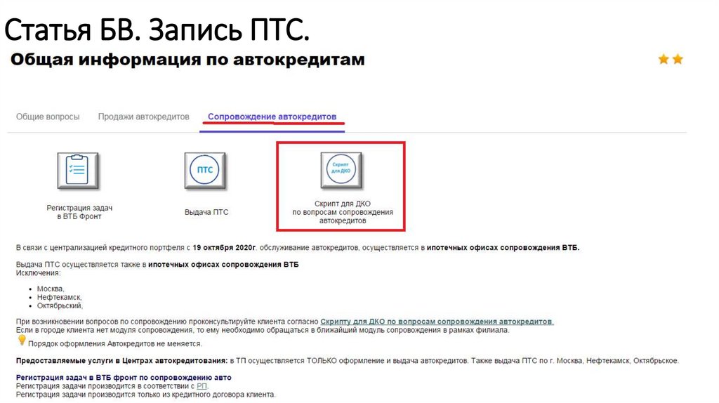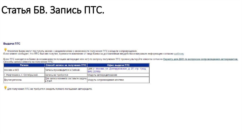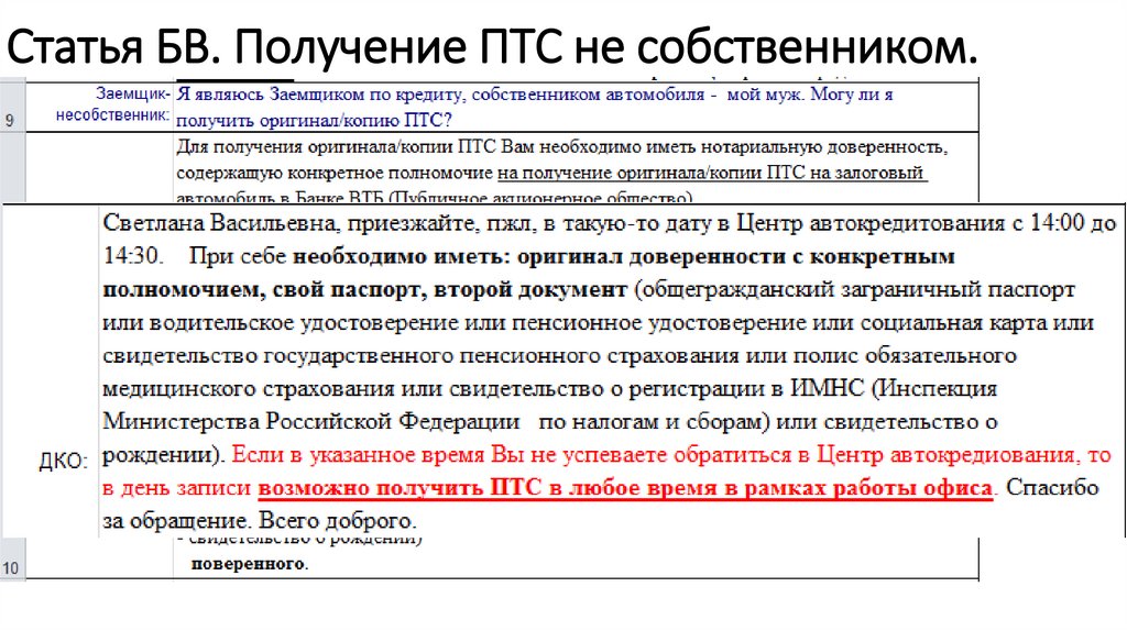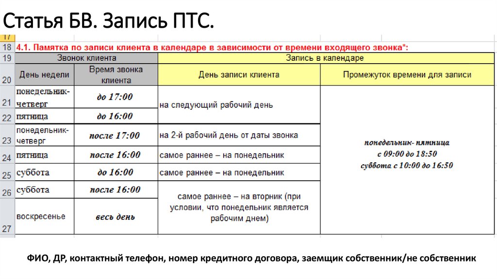 Статья БВ. Запись ПТС.ФИО, ДР, контактный телефон, номер кредитного договора, заемщик собственник/не собственник