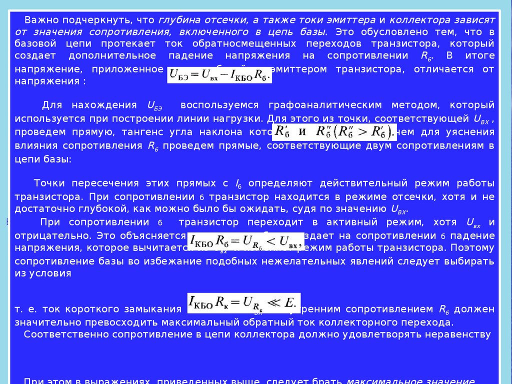 Важно подчеркнуть, что глубина отсечки, а также токи эмиттера и коллектора зависятот значения сопротивления, включенного в цепь базы. Это обусловлено тем, что в