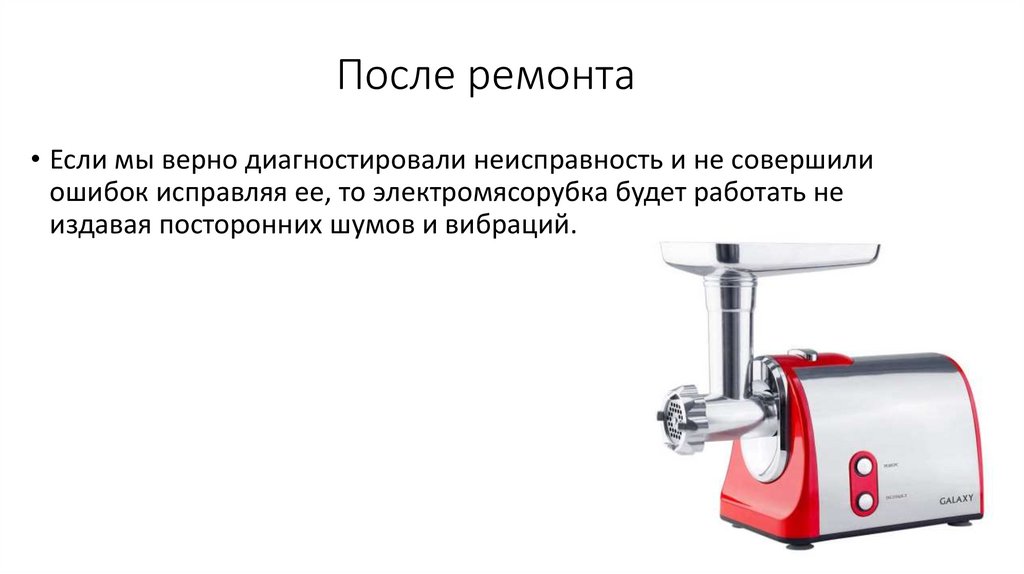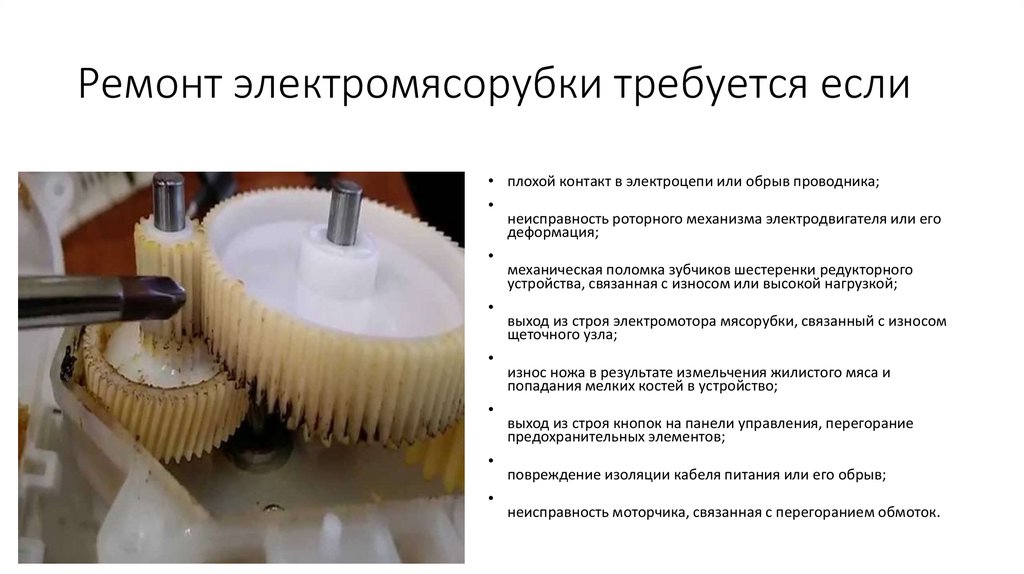 Ремонт электромясорубки требуется если• плохой контакт в электроцепи или обрыв проводника;
