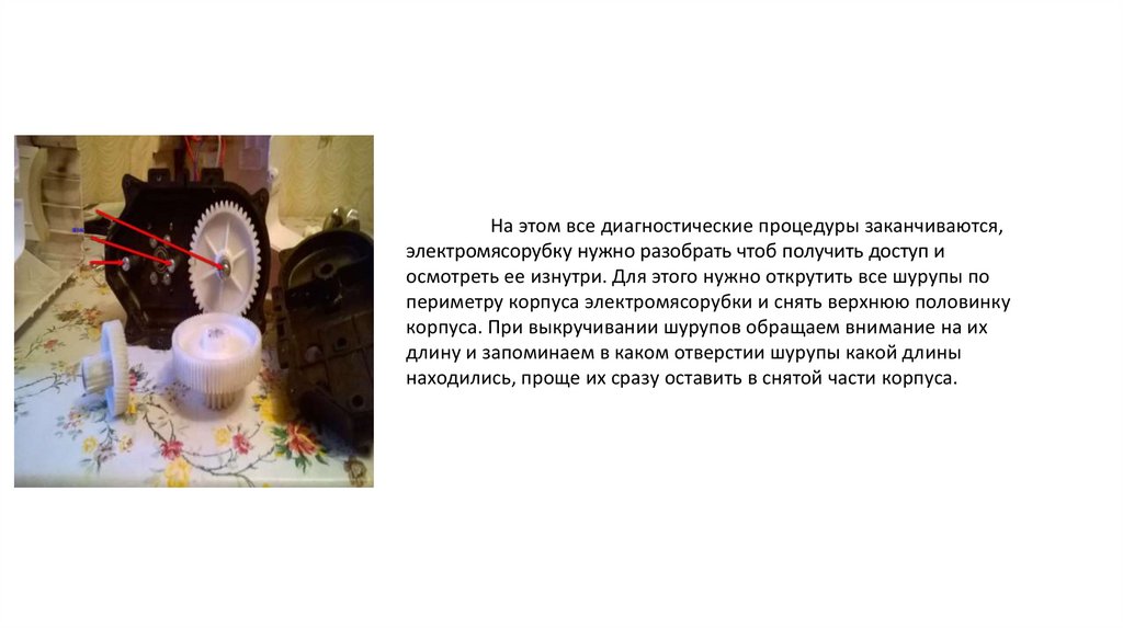 На этом все диагностические процедуры заканчиваются,электромясорубку нужно разобрать чтоб получить доступ и