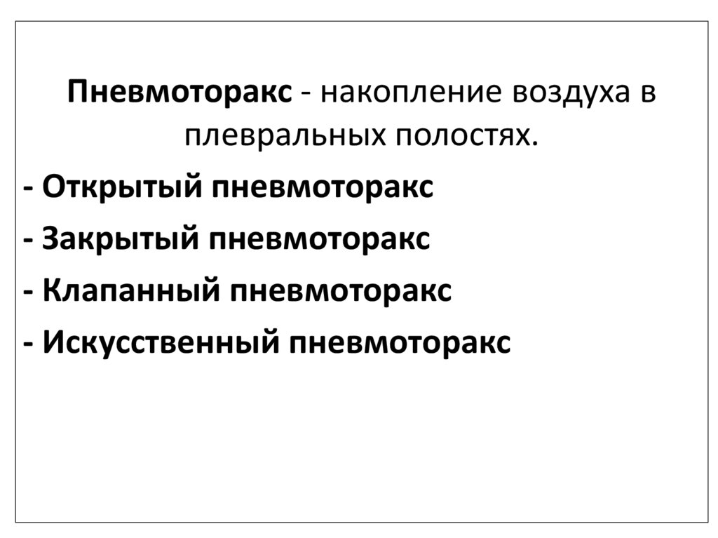 Пневмоторакс - накопление воздуха вплевральных полостях.