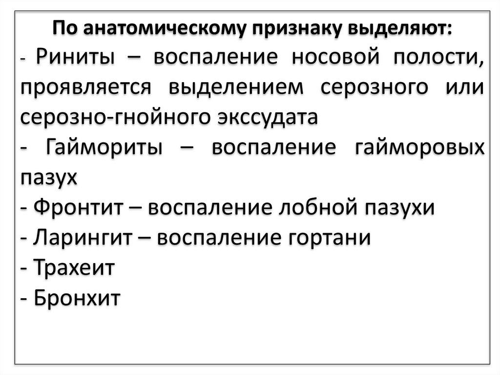 По анатомическому признаку выделяют:Риниты – воспаление носовой полости,