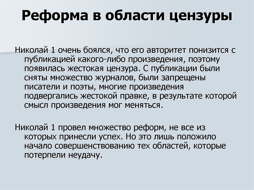 Реформа в области цензурыНиколай 1 очень боялся, что его авторитет понизится с