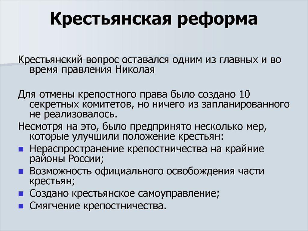 Крестьянская реформаКрестьянский вопрос оставался одним из главных и во