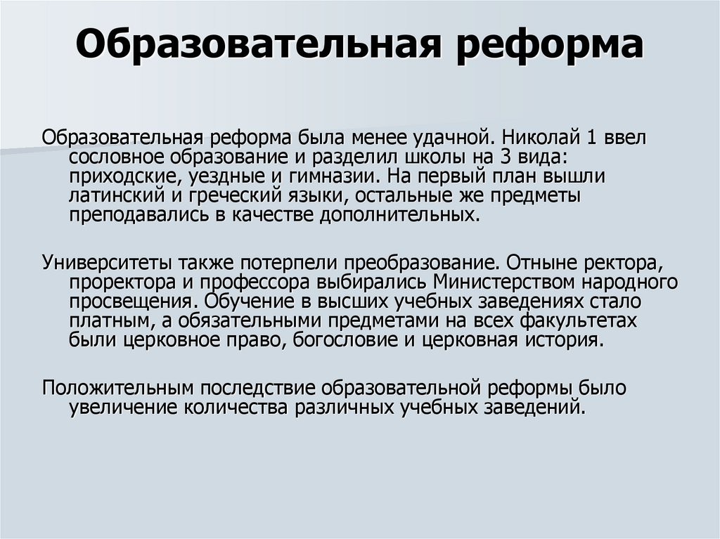 Образовательная реформаОбразовательная реформа была менее удачной. Николай 1 ввел