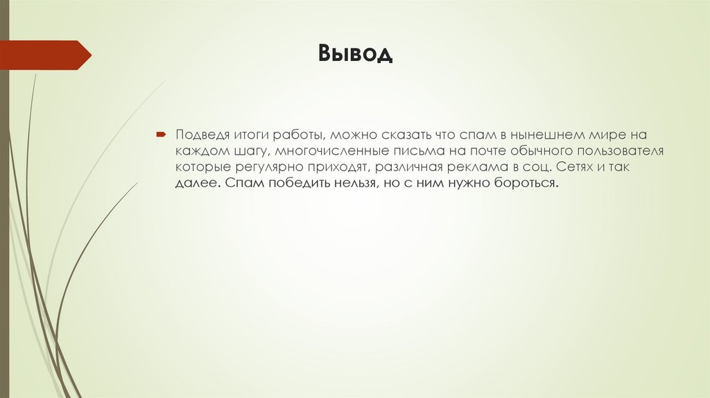 ВыводПодведя итоги работы, можно сказать что спам в нынешнем мире на