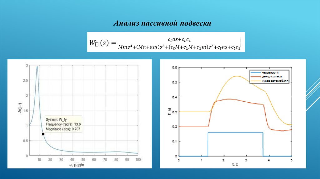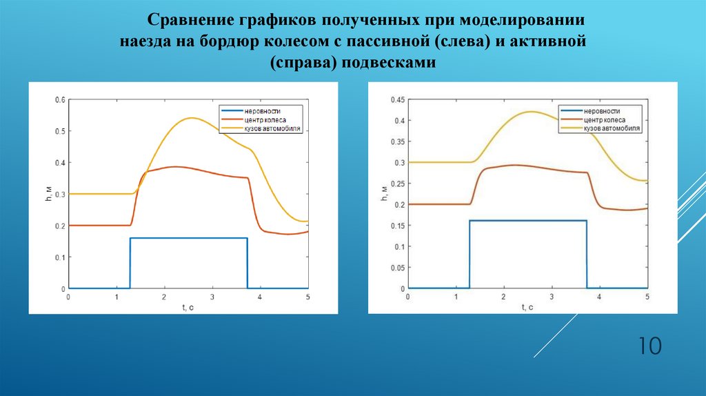 Сравнение графиков полученных при моделированиинаезда на бордюр колесом с пассивной (слева) и активной