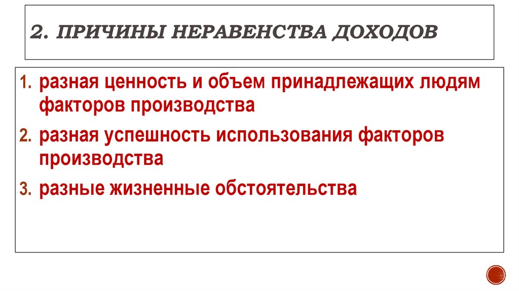 2. ПРИЧИНЫ НЕРАВЕНСТВА ДОХОДОВ1. разная ценность и объем принадлежащих людям