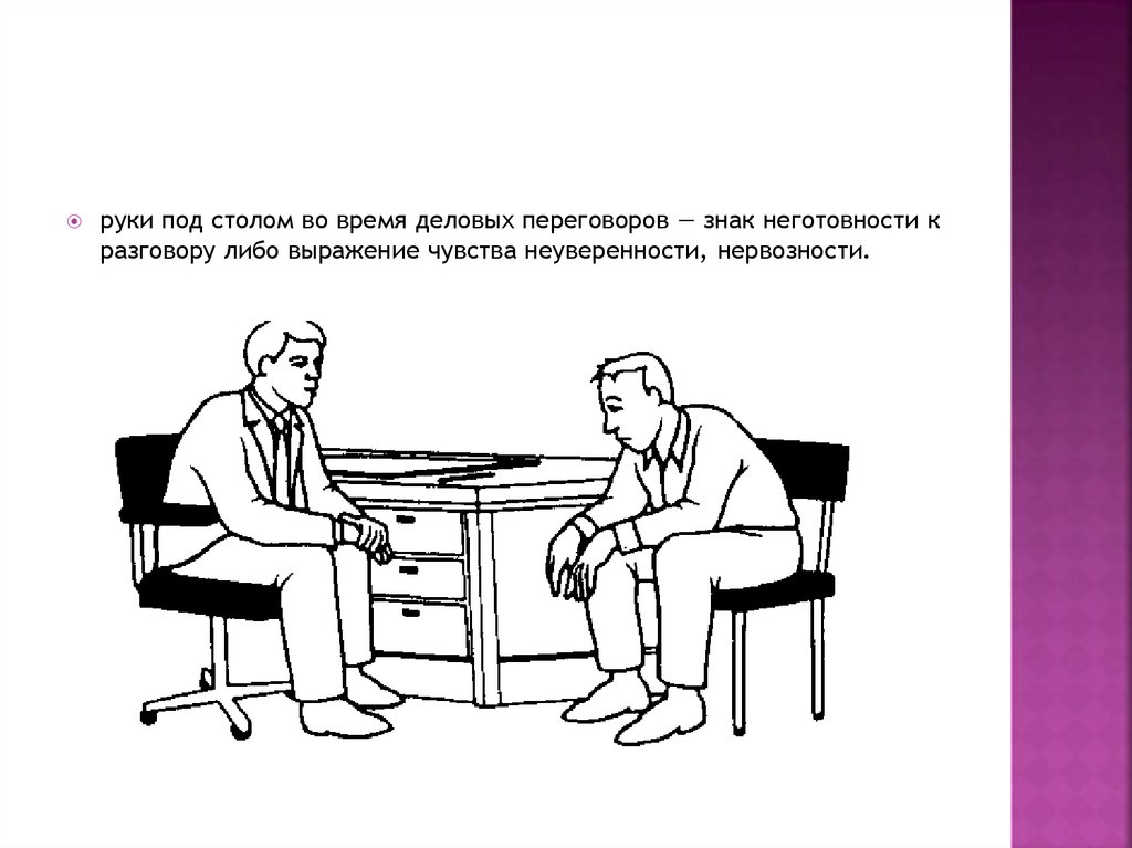 руки под столом во время деловых переговоров — знак неготовности кразговору либо выражение чувства неуверенности, нервозности.