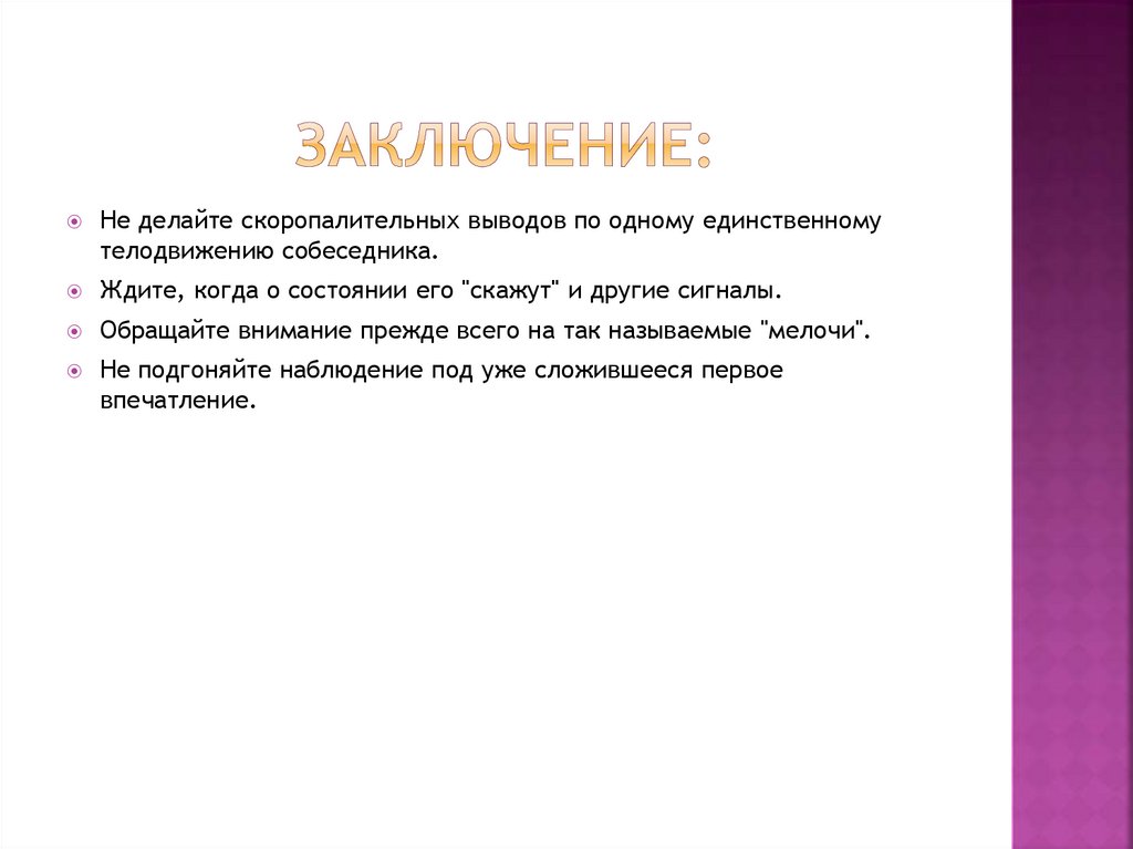 Не делайте скоропалительных выводов по одному единственномутелодвижению собеседника.