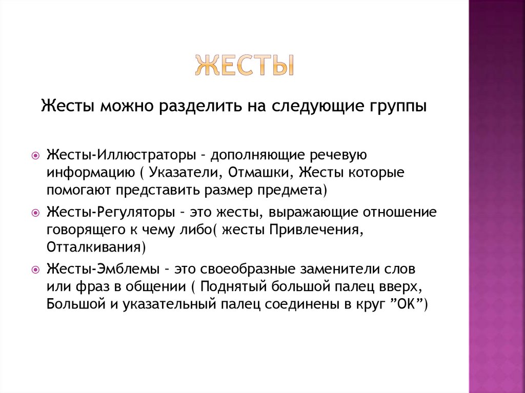 Жесты можно разделить на следующие группыЖесты-Иллюстраторы – дополняющие речевую