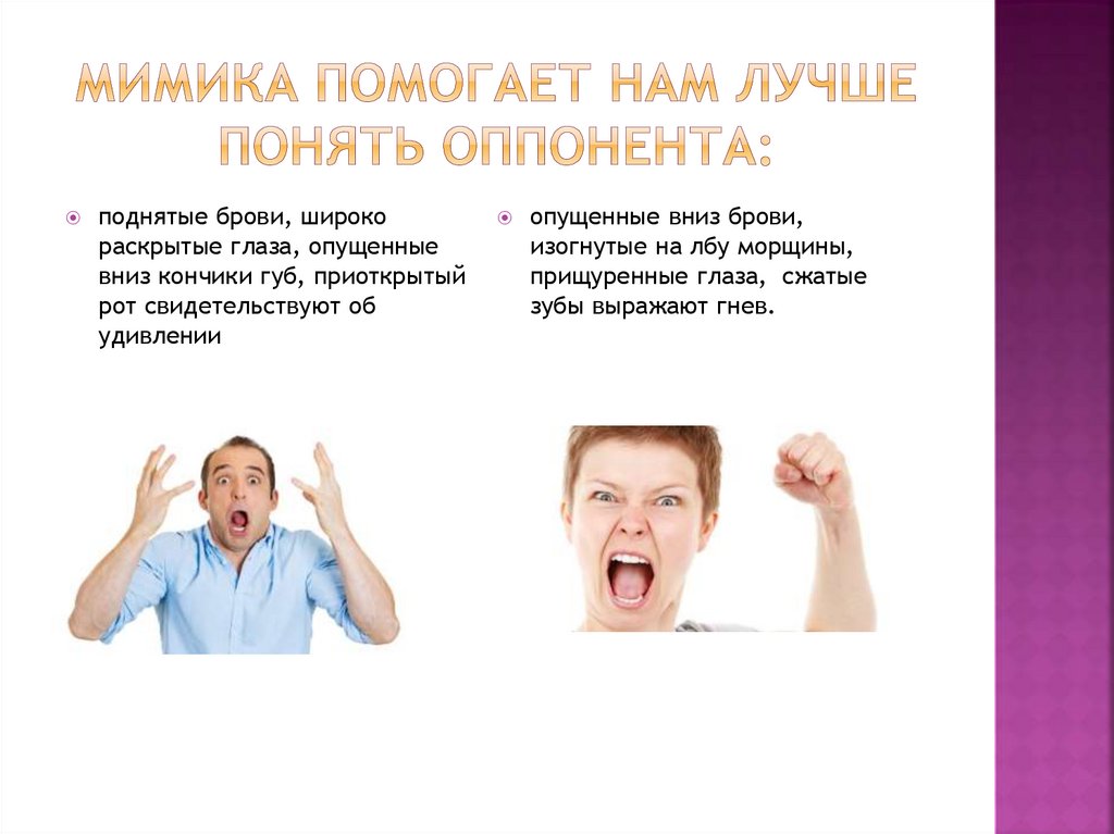 поднятые брови, широкораскрытые глаза, опущенные