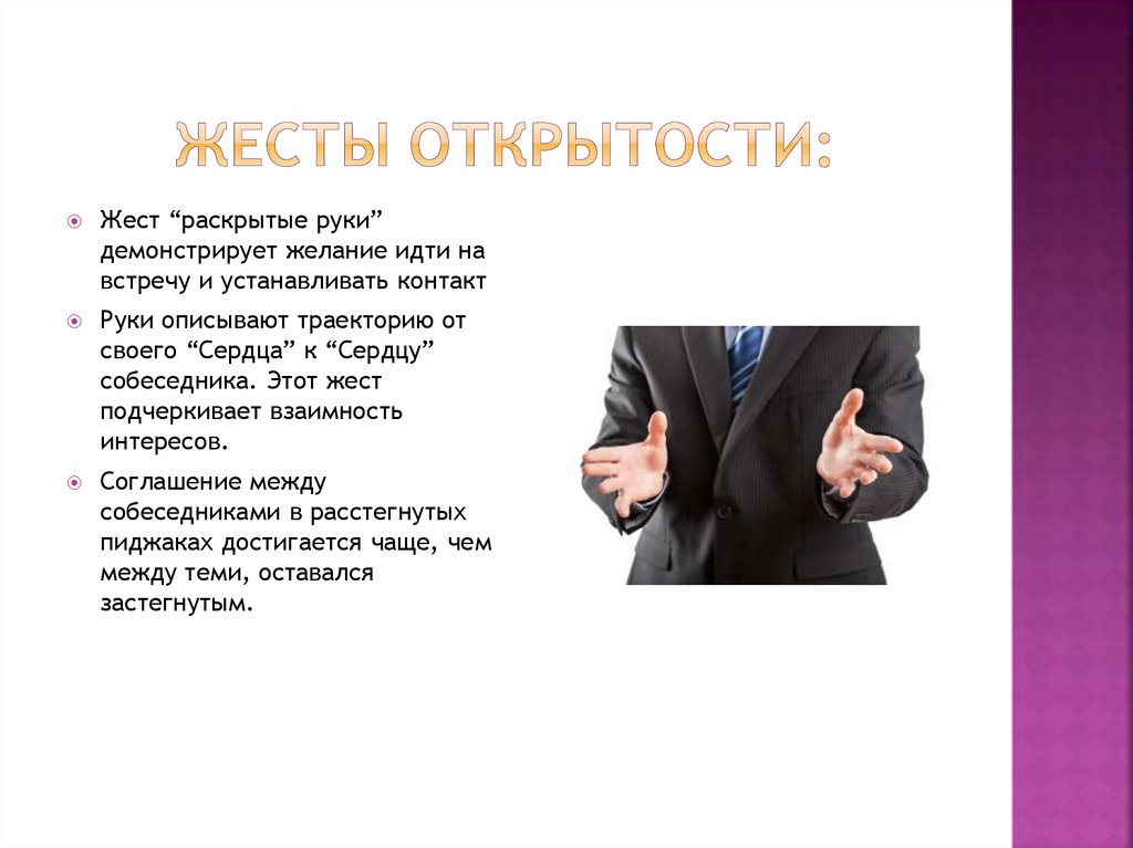 Жест “раскрытые руки”демонстрирует желание идти на