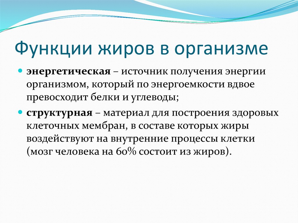 Функции жиров в организмеэнергетическая – источник получения энергии