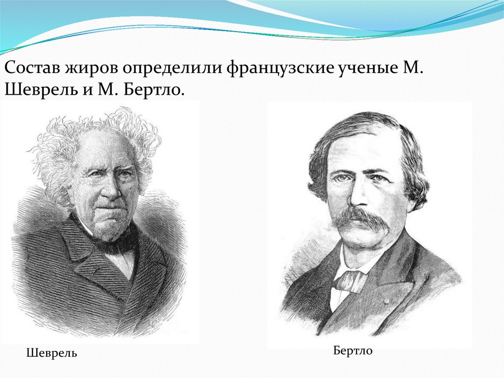 Состав жиров определили французские ученые М.Шеврель и М. Бертло.