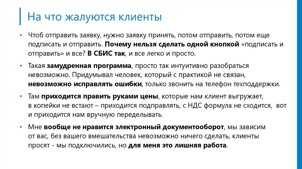 На что жалуются клиенты• Чтоб отправить заявку, нужно заявку принять, потом отправить, потом еще