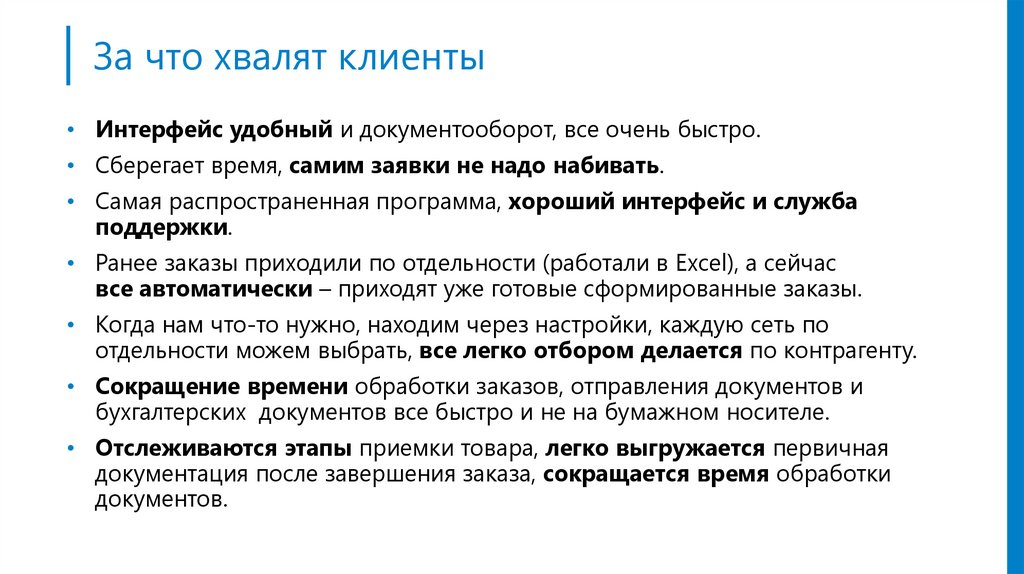 За что хвалят клиенты• Интерфейс удобный и документооборот, все очень быстро.
