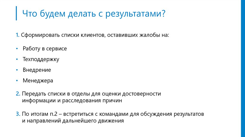 Что будем делать с результатами?1. Сформировать списки клиентов, оставивших жалобы на:
