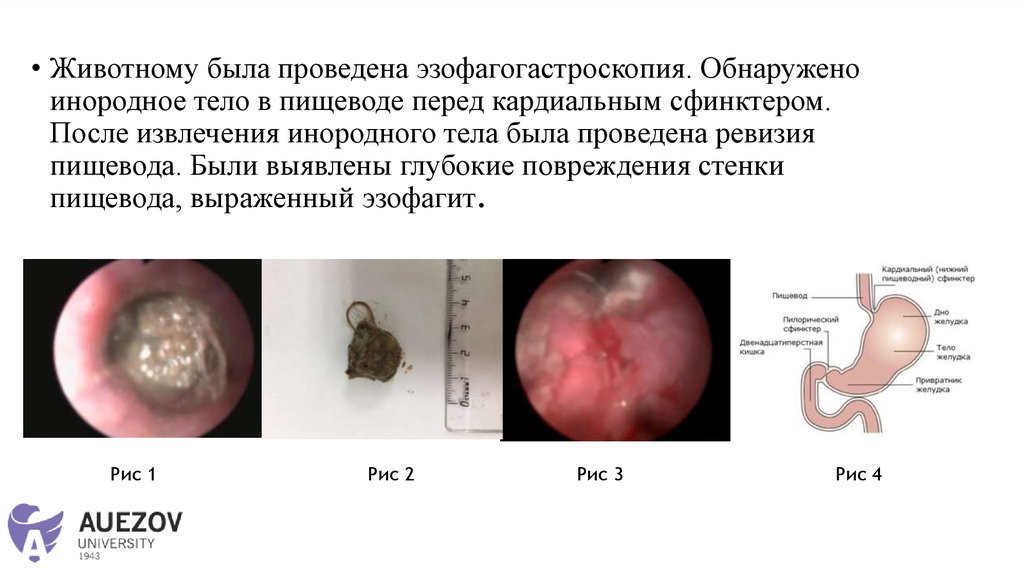 • Животному была проведена эзофагогастроскопия. Обнаруженоинородное тело в пищеводе перед кардиальным сфинктером.