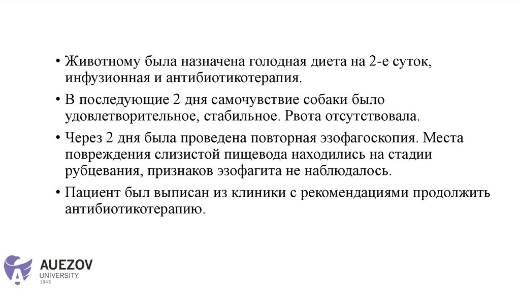 • Животному была назначена голодная диета на 2-е суток,инфузионная и антибиотикотерапия.